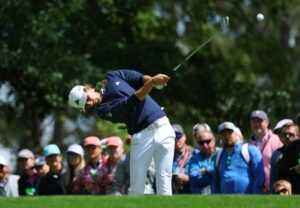 Golf – The Masters – Augusta National Golf Club – Augusta, Georgia, U.S. – April 9, 2023 Chile’s Joaquin Niemann hits his tee shot on the 4th hole during the final round REUTERS/Mike Segar