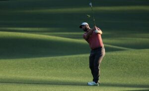 Golf – The Masters – Augusta National Golf Club – Augusta, Georgia, U.S. – April 9, 2023 Spain’s Jon Rahm chips onto the 18th green during the final round REUTERS/Mike Blake