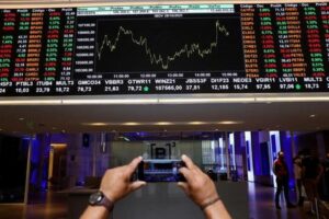 FOTO DE ARCHIVO. Un hombre toma una foto con su teléfono de un tablero electrónico que muestra las fluctuaciones de los índices bursátiles en la Bolsa de Valores B3 de Brasil en Sao Paulo, Brasil, el 28 de octubre de 2021. REUTERS/Amanda Perobelli