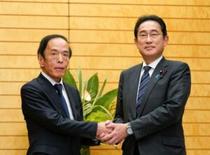 New Governor of Bank of Japan Kazuo Ueda meets Japanese Prime Minister Fumio Kishida at prime minister?s official residence in Tokyo, Japan, April 10, 2023. Kimimasa Mayama/Pool via REUTERS
