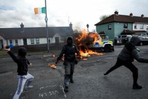 Members of nationalist group ‘Dissident Republicans’ throw petrol bombs at a police car as nationalists hold an anti-agreement rally on the 25th anniversary of the peace deal, in Londonderry, Northern Ireland, April 10, 2023. REUTERS/Clodagh Kilcoyne