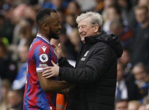 Soccer Football – Premier League – Leeds United v Crystal Palace – Elland Road, Leeds, Britain – April 9, 2023 Crystal Palace’s Jordan Ayew with manager Roy Hodgson after being substituted Action Images via Reuters/Jason Cairnduff