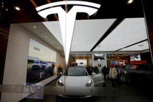 FILE PHOTO: Visitors check a Tesla Model 3 car next to a Model Y displayed at a showroom of the U.S. electric vehicle (EV) maker in Beijing, China February 4, 2023. REUTERS/Florence Lo