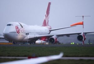 FILE PHOTO: Cosmic Girl, a Virgin Boeing 747-400 aircraft sits on the tarmac with Virgin Orbit’s LauncherOne rocket attached to the wing, ahead of the first UK launch tonight, at Spaceport Cornwall at Newquay Airport in Newquay, Britain, January 9, 2023. REUTERS/Henry Nicholls/File Photo