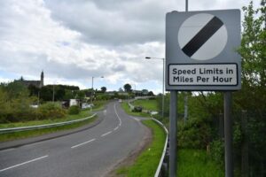 FILE PHOTO: A road sign is seen indicating speed limits are changing from kilometres per hour to miles per hour on the border between Northern Ireland and Ireland along the M1 motorway, as seen from Carrickcarnan, Ireland, May 19, 2022. REUTERS/Clodagh Kilcoyne
