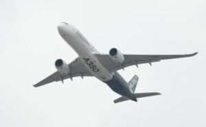FILE PHOTO: An Airbus A350 aircraft during a display at the Farnborough International Airshow, in Farnborough, Britain, July 20, 2022. REUTERS/Peter Cziborra