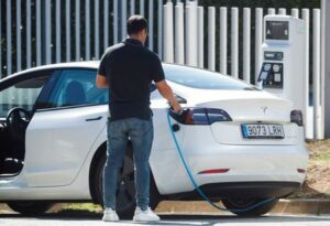 FILE PHOTO: A man removes a cable after charging a Tesla electric car at a public charging point in Sant Cugat del Valles, near Barcelona, Spain, September 17, 2021. REUTERS/Albert Gea/File Photo