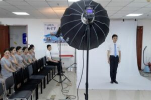 FILE PHOTO: An applicant has his picture taken during a recruiting session for cabin crew jobs at Hainan Airlines in Beijing, China, March 30, 2023. REUTERS/Thomas Peter