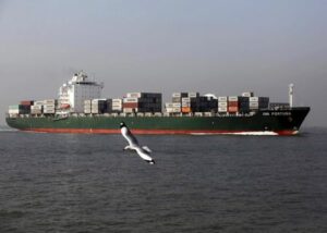 FILE PHOTO: A seagull flies past a cargo container ship off the coast of Mumbai, India, December 3, 2015. REUTERS/Shailesh Andrade