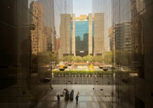 FILE PHOTO: A man walks between the buildings at a commercial centre in New Delhi, India, February 28, 2023. REUTERS/Altaf Hussain