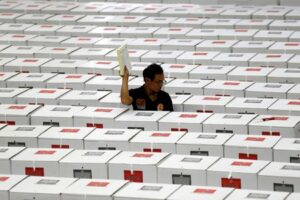 FILE PHOTO: A worker carries election materials as he prepares ballot boxes before their distribution to polling stations in a warehouse in Jakarta, Indonesia, April 15, 2019. REUTERS/Willy Kurniawan/File Photo