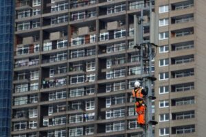 FOTO DE ARCHIVO. Un ingeniero trabaja en un mástil de telefonía móvil en Londres, Reino Unido. 21 de noviembre de 2018. REUTERS/Simon Dawson