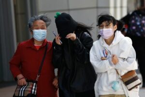 People walk against the wind amid a sandstorm on a April 11, 2023 April 11, 2023 People walk against the wind amid a sandstorm on a street in Beijing, China April 11, 2023. REUTERS/Tingshu Wang
