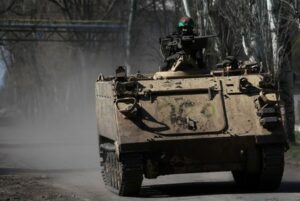An armoured military vehicle speeds through Chasiv Yar during heavy fighting at the frontline of Bakhmut and Chasiv Yar, Ukraine, April 10, 2023. REUTERS/Kai Pfaffenbach