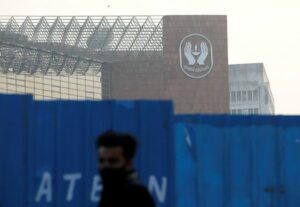 FILE PHOTO: A man walks past a logo of Life Insurance Corporation of India (LIC) at one of its offices in New Delhi, India January 24, 2022. Picture taken on January 24, 2022. REUTERS/Adnan Abidi/File Photo