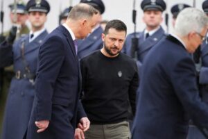 FILE PHOTO: Poland’s President Andrzej Duda welcomes Ukrainian President Volodymyr Zelenskiy at the Presidential Palace in Warsaw, Poland, April 5, 2023. REUTERS/Aleksandra Szmigiel/File Photo