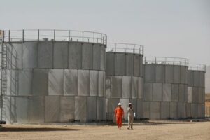FILE PHOTO: Workers walk past storage tanks at Tullow Oil’s Ngamia 8 drilling site in Lokichar, Turkana County, Kenya, February 8, 2018. REUTERS/Baz Ratner