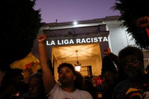 People gesture in front of a projection that reads “La Liga racist”, as they protest in solidarity with Real Madrid soccer player Vinicius Jr, who was racially abused during a club match in Spain, near the consulate of Spain in Sao Paulo, Brazil May 23, 2023. REUTERS/Amanda Perobelli