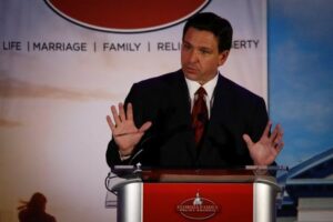 FILE PHOTO: Florida Governor Ron DeSantis gestures as he speaks during the Florida Family Policy Council Annual Dinner Gala, in Orlando, Florida, U.S., May 20, 2023. REUTERS/Marco Bello