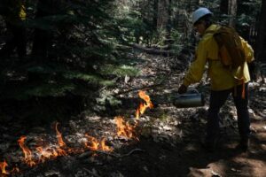 Local land owner Sarah Fischbach uses a drip torch while taking part in a broadcast burn in advance of wildfire season near Blodgett Forest Research Station in Georgetown, California, U.S., May 20, 2023. REUTERS/Loren Elliott