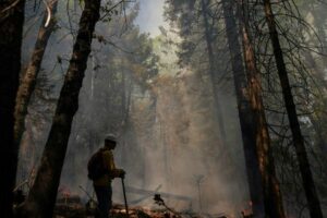 Volunteer David Palmer takes part in a broadcast burn in advance of wildfire season near Blodgett Forest Research Station in Georgetown, California, U.S., May 20, 2023. REUTERS/Loren Elliott