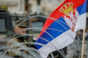 An Italian member of the NATO-led Kosovo Force (KFOR) looks on while standing guard in Leposavic, Kosovo, June 1, 2023. REUTERS/Ognen Teofilovski