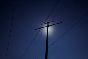 FILE PHOTO: A newly installed pole for transmission lines for the New England Clean Energy Connect project (also known as the Clean Energy Corridor), which will bring hydroelectric power to the New England power grid, stand next to existing power lines in Moscow, Maine, U.S., October 7, 2021. REUTERS/Brian Snyder