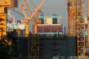 FILE PHOTO: Two large container ships and a tanker can be seen under construction in a ship yard close to Busan, South Korea October 25, 2017. Picture taken October 25, 2017. REUTERS/Henning Gloystein/File Photo