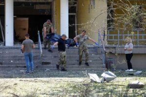 ARCHIV: Gerichtsmediziner tragen die Leiche einer Frau, die bei einem russischen Raketenangriff auf die Ukraine getötet wurde, am 1. Juni 2023 in Kiew, Ukraine. REUTERS/Valentyn Ogirenko