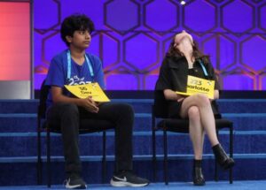 Charlotte Walsh, 14, tosses her head back after she made it to the next round during the final of the Scripps National Spelling Bee competition in National Harbor, Maryland U.S., June 1, 2023. REUTERS/Leah Millis