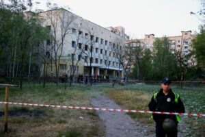 Emergency services personnel near a cordon after a Russian missile strike at a compound of a municipal clinic, amid Russia’s attack on Ukraine, in Kyiv, Ukraine June 1, 2023. REUTERS/Valentyn Ogirenko