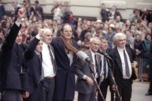 FILE PHOTO: Acquitted members of the Birmingham Six, sent to prison in 1975 for the IRA’s bombing of two pubs, gather with their Member of Parliament (C) after they walk from court as free men, March 14, 1991. (L – R) John Walker, Patrick Hill, Hugh Callaghan, their MP Chris Mullen (with scarf), Richard McIlkenny, Gerry Hunter and William Power. REUTERS/Chris Helgren/File Photo