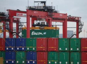 FILE PHOTO: A crane lifts a Eucon shipping container on the quay side of Dublin Port container terminal in Dublin, Ireland, May 25, 2023. REUTERS/Phil Noble/File Photo