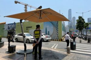 Security personnel stand in shade amid a yellow alert for heatwave in Shenzhen, Guangdong province, China June 2, 2023. REUTERS/David Kirton