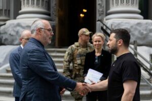 Ukraine’s President Volodymyr Zelenskiy and Estonian President Alar Karis shake hands after a joint press briefing, amid Russia’s attack on Ukraine, in Kyiv, Ukraine June 2, 2023. Ukrainian Presidential Press Service/Handout via REUTERS