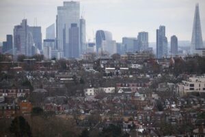 FILE PHOTO: Rows of houses lie in front of the City of London skyline in London, Britain, March 19, 2023. REUTERS/Henry Nicholls/File Photo