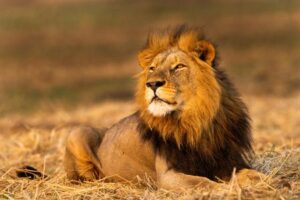 An eight-year-old male African lion rests on the plains of Kafue National Park, Zambia, September 19, 2020. Courtesy of Sebastian Kennerknecht/Handout via REUTERS