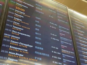 FILE PHOTO: A view shows a departures board at Sheremetyevo airport, after Russia closed its airspace to airlines from 36 countries in response to Ukraine-related sanctions targeting its aviation sector, in Moscow, Russia February 28, 2022. REUTERS/Stringer