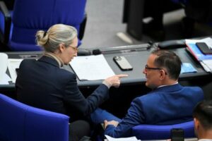 FILE PHOTO: German parliamentary group co-leaders of Alternative for Germany (AfD) party Alice Weidel and Tino Chrupalla attend a plenary session of the lower house of parliament, Bundestag, in Berlin, Germany May 25, 2023. REUTERS/Annegret Hilse