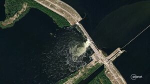 FILE PHOTO: A satellite image shows Nova Kakhovka Dam, amid Russia’s attack on Ukraine, in Kherson region, Ukraine, June 4, 2023. PLANET LABS PBC/Handout via REUTERS
