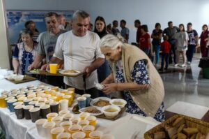 Residents of the Shebekinsky district of Russia’s Belgorod region, who were evacuated following recent attacks on settlements near the Russia-Ukraine border in the course of a military conflict, queue to receive their meals at a temporary accommodation centre located in a sports facility in the city of Belgorod, Russia, June 7, 2023. REUTERS/Maxim Shemetov