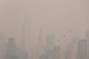 El horizonte de Manhattan se ve cubierto de neblina y humo causado por un incendio forestal en Canadá, en Nueva York, EEUU, 7 de junio de 2023. REUTERS/Amr Alfiky