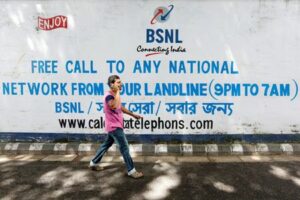 FILE PHOTO: A man speaks on his mobile phone as he walks past a Bharat Sanchar Nigam Ltd (BSNL) advertisement painted on a wall outside its office in Kolkata, India, August 24, 2017. Picture taken August 24, 2017. REUTERS/Rupak De Chowdhuri