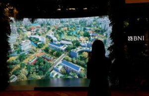 An attendee films a video presentation of Indonesia’s new planned capital Nusantara, at Ecosperity Week in Singapore June 7, 2023. REUTERS/Edgar Su