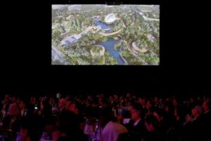 Attendees watch a video presentation of Indonesia’s planned capital Nusantara, at Ecosperity Week in Singapore June 7, 2023. REUTERS/Edgar Su
