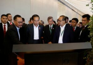 Indonesia’s President Joko Widodo looks at a video presentation of the planned new capital Nusantara, at Ecosperity Week in Singapore June 7, 2023. REUTERS/Edgar Su