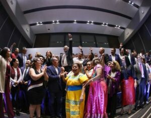 Mexican Foreign Minister Marcelo Ebrard raises his fist while announcing he will resign next week to focus on winning the nomination of the leftist National Regeneration Movement (MORENA) ruling party for next year’s presidential election, at a hotel in Mexico City, Mexico, June 6, 2023. Mexico Ministry of Foreign Affairs/Handout via REUTERS