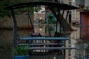 A woman walks in a flooded yard, after the Nova Kakhovka dam breached, amid Russia’s attack on Ukraine, in Kherson, Ukraine June 6, 2023. REUTERS/Alina Smutko