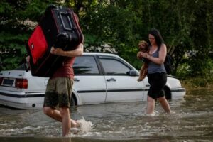 Local residents carry their personal belongings on a flooded street, after the Nova Kakhovka dam breached, amid Russia’s attack on Ukraine, in Kherson, Ukraine June 6, 2023. REUTERS/Alina Smutko