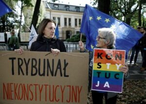 FILE PHOTO: Protesters attend a demonstration in front of the Constitutional Tribunal building in Warsaw, Poland September 22, 2021. REUTERS/Kacper Pempel